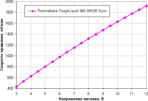 Диапазон регулировки скорости вращения довольно широкий, есть плавный близкий к линейному рост скорости вращения при изменении коэффициента заполнения (КЗ) от 35% до 100%. Отметим, что при КЗ 0% вентиляторы не останавливаются, что может иметь значение в гибридной системе охлаждения с пассивным режимом на минимальной нагрузке.