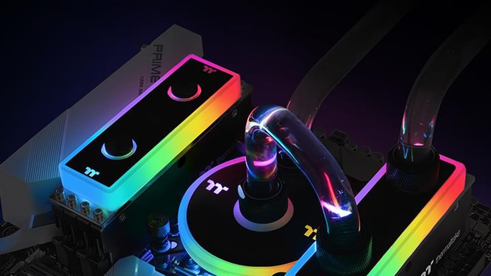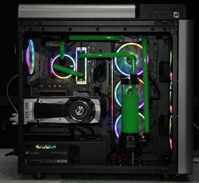 Для того, чтобы мы смогли протестировать набор WaterRam RGB, компания Thermaltake предоставила ПК, собранный в корпусе Level 20 GT и оснащенный системой жидкостного охлаждения процессора, скомпонованной из дискретных компонентов (радиатор, помпа с резервуаром и водоблок на процессор). Для подключения WaterRam RGB дополнительно понадобились жесткие прозрачные трубки (наружный диаметр 16 мм), пара фитингов, труборез, направляющая и силиконовая вставка для гибки трубок (плюс строительный фен и ловкость рук). После нескольких попыток и испорченных кусков трубок удалось подключить WaterRam RGB более-менее аккуратным способом: