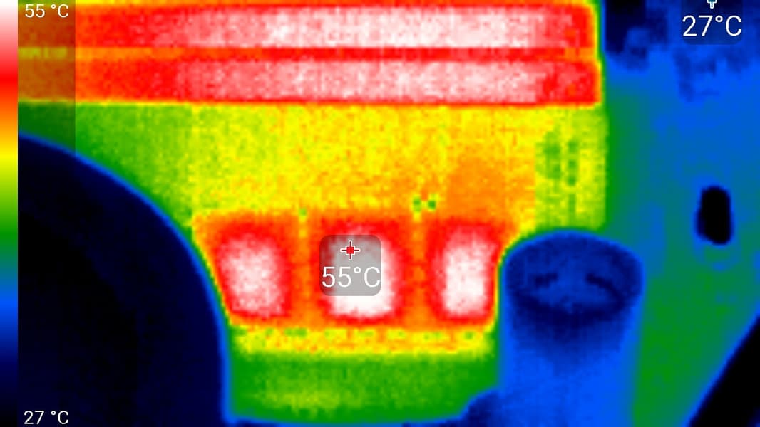 В случае модулей WaterRam RGB без радиаторов теплокамера показала, что микросхемы памяти на модулях снаружи могут нагреваться до 55 °C: