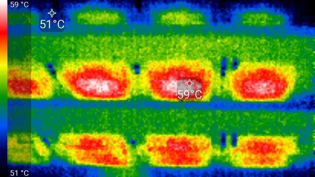 А на модулях в центре — до 59 °C, что выше, чем показывают датчики температуры.
