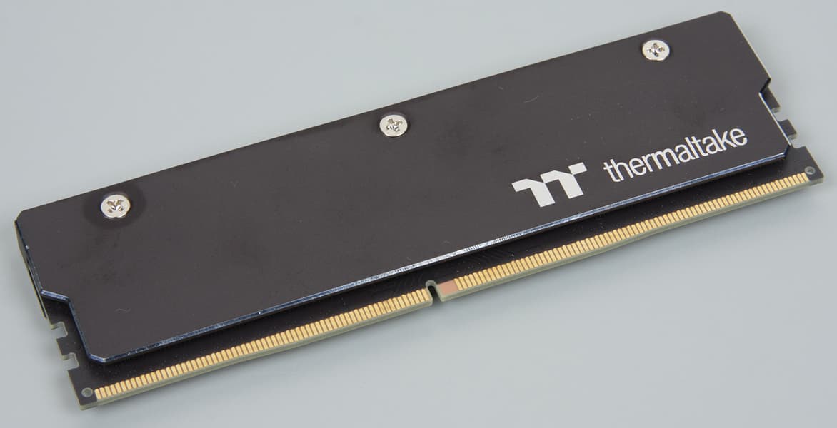 Радиаторы на модулях памяти представляют собой две алюминиевые пластины, анодированные и покрашенные черным, с блестящей полированной фаской по периметру снаружи. Одна пластина просто плоская, а ответная ей — с выступом. Эта вторая прижимается к той стороне планки, где расположены микросхемы памяти. Чтобы улучшить тепловой контакт с поверхностью чипов на этой пластине есть мягкая термопрокладка (серая). Другая пластина контактирует с обратной плоской стороной печатной платы модуля памяти и оснащена красноватой термопрокладкой с немного более высокой жесткостью. Эти пластины стягиваются тремя винтами, прижимающими пластины друг к другу и к планкам памяти. Для улучшения теплового контакта между пластинами вложены тонкие красноватые термопрокладки.