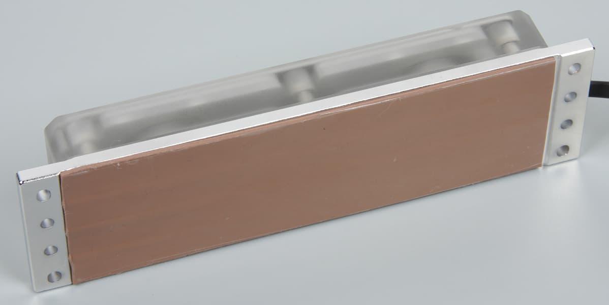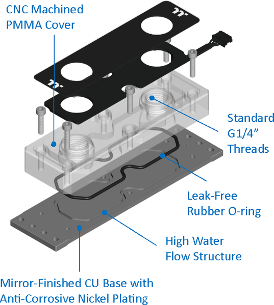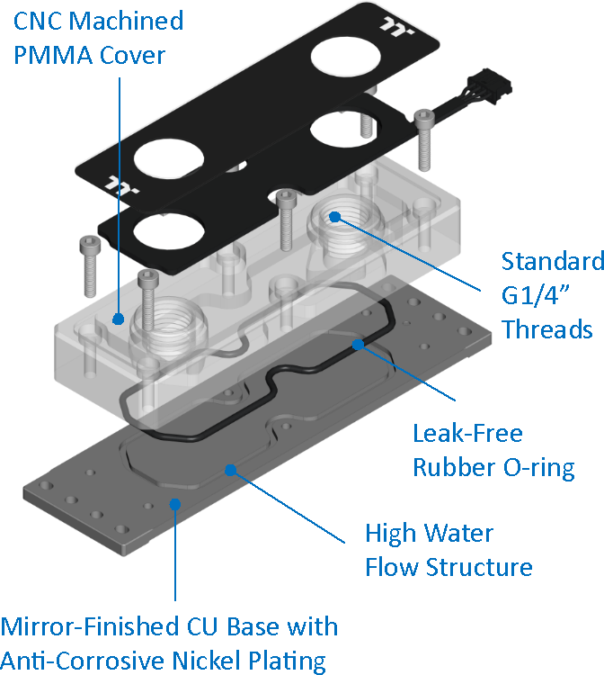 Небольшой шестигранный ключ также включен в комплект поставки. До установки отверстия в водоблоке закрыты заглушками. Водоблок представляет собой толстую медную пластину (3,9 мм), покрытую никелем. Сверху на пластине закреплен резервуар, выточенный из прозрачного пластика (производитель указывает, что это PMMA, то есть полиметилметакрилат, или, как его называют в обиходе, органическое стекло). Этот резервуар оснащен отверстиями со стандартной трубной резьбой G¼″. Охлаждающая жидкость подается в одно отверстие и выходит через другое, охлаждая медную пластину. С одного узкого торца из водоблока выходит короткий «хвостик» (8,5 см) кабеля подсветки с четырехконтактным небольшим разъемом «мама». На водоблоке сверху наклеен лист прочного прозрачного пластика, прикрывающий крепежные винты и светодиоды подсветки. Светодиодов всего 12 штук, они расположены по периметру, многоцветные и адресуемые. Скорее всего, используются традиционные RGB-светодиоды WS2812 с интегрированным контролером. Изнутри пластиковая пластина имеет черное покрытие, которое в местах отсутствия образует два логотипа производителя. Снизу на медный теплоотвод не то чтобы наклеена, а просто приложена мягкая (но не очень) термопрокладка. До установки ее защищает толстая пластиковая пленка.