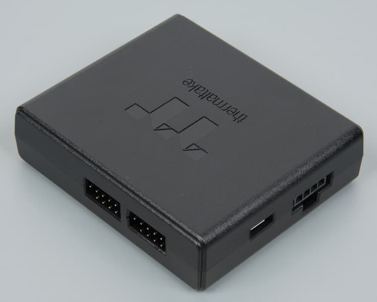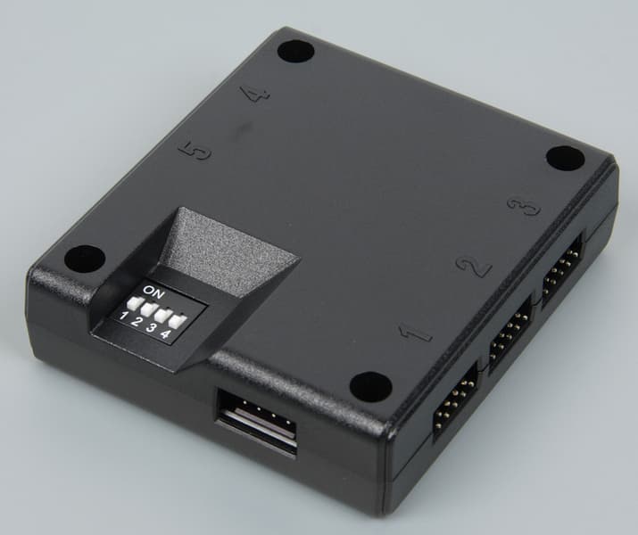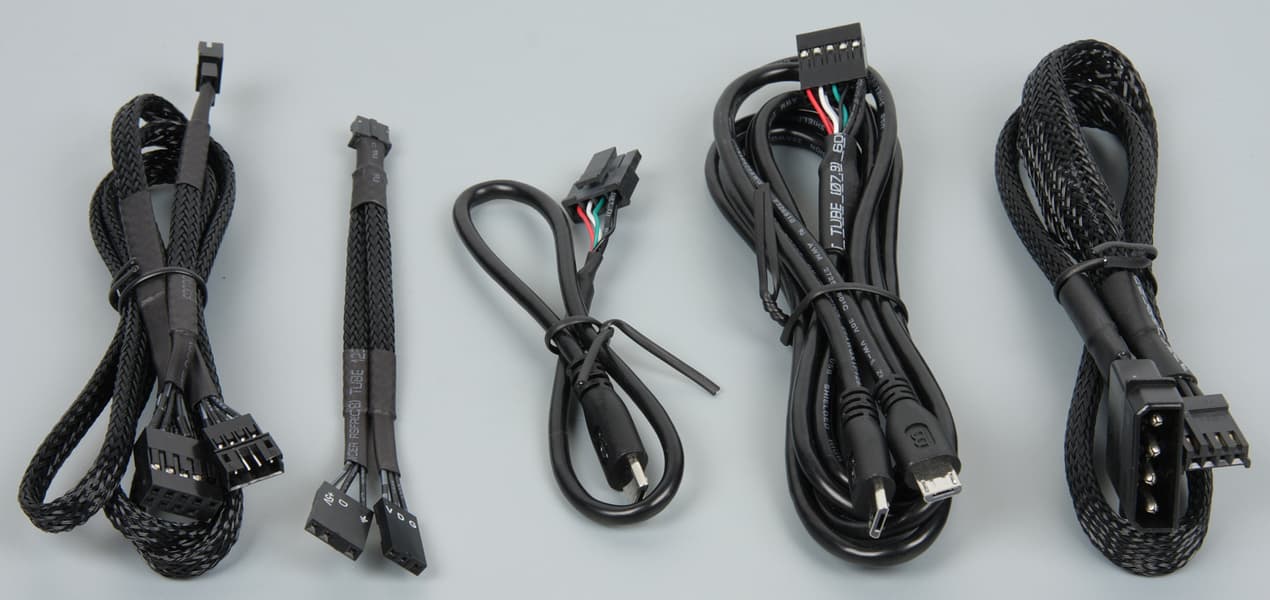 Контроллер к источнику питания подключается кабелем (длиной 50 см, последний на фотографии ниже) с периферийным разъемом («типа Molex»). Соединять эти разъемы в варианте, когда обе части на кабеле, не всегда просто, поэтому если на кабеле от блока питания есть свободный разъем питания для 3,5″ дисковода, то лучше подключить этот разъем непосредственно к контроллеру. Два кабеля с разъемами Micro-USB (по 88 см каждый, предпоследний) выходят из одного разъема к колодке USB 2.0. Этими кабелями соединяется контроллер и системная плата. Так как разъемов Micro-USB два, то к одной колодке подключить можно сразу два контроллера. Вторым способом увеличения числа подключенных контроллеров является использование последовательного соединения контроллеров специальным входящим в комплект кабелем (28 см, третий). Для адресации контроллера в системе его номер выставляется с помощью переключателей на нижней стороне контроллера. В системе одновременно может работать до 16 независимо управляемых контроллеров, и к каждому может быть подключено до 5 вентиляторов, или водоблоков, или других устройств, что в итоге дает до 80 независимо управляемых устройств. Устройства подключаются к 9-штырьковым разъемам на контроллере. На одной грани контроллера 3 таких разъема, на второй — 2. Исследование функций контактов показало, четыре в ряд — это земля (общий контакт), питание 12 В, вход датчика вращения вентилятора и выход управления с помощью ШИМ, а четыре контакта во втором ряду используются для управления RGB-подсветкой. В данном случае используются только эти четыре контакта. Водоблок подключается к контроллеру кабелем с ответным четырехконтактным разъемом типа «папа» (90 см, первый). Можно не использовать контроллер, а подключить водоблок к материнской плате, поддерживающей управление адресуемой подсветкой. Для этого нужно воспользоваться кабелем-адаптером с двумя типами разъемов (ответвления по 10 см, второй). Этот кабель подключается к ответвлению (10 см) на основном кабеле подсветки.