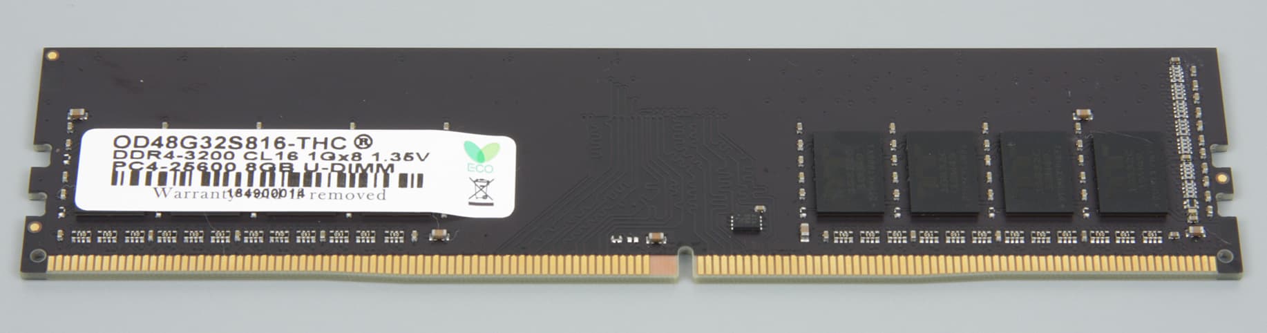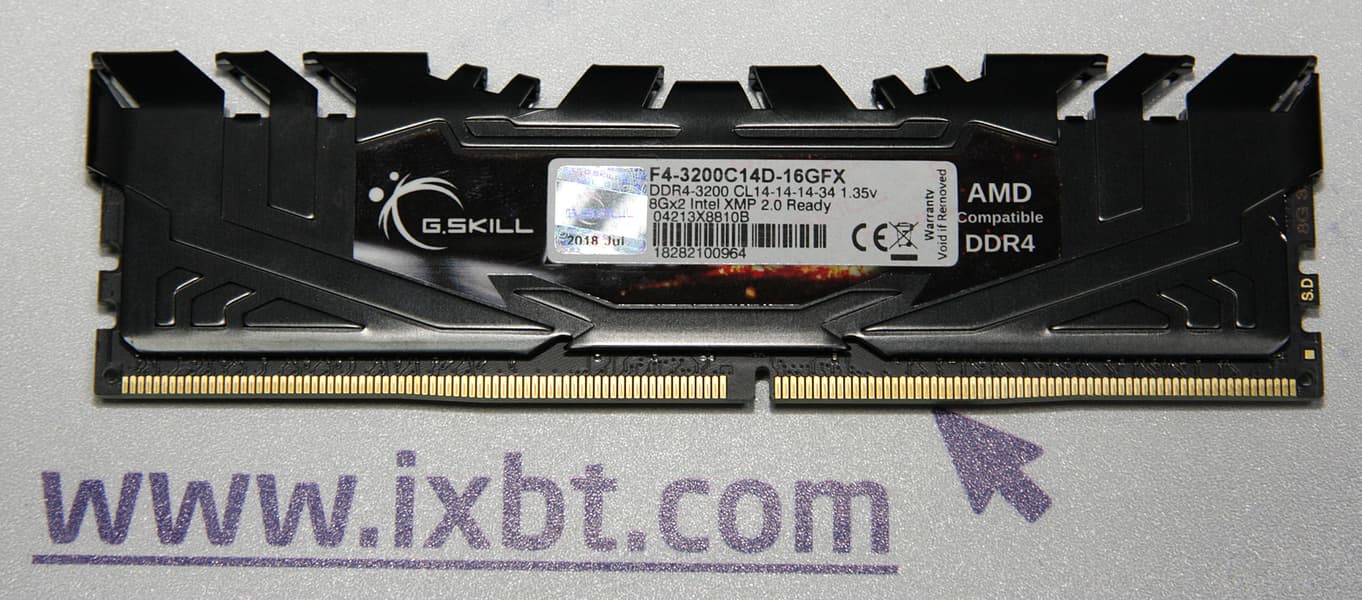 Слегка разочаровывает наклейка на половине микросхем памяти, которая явно не улучшает теплоотвод. Сам модуль по скорости рекордов не бьет — 3200 МГц при задержках 16-18-18-38. Производитель позиционирует их в середину категории «оверклокерских» модулей памяти.