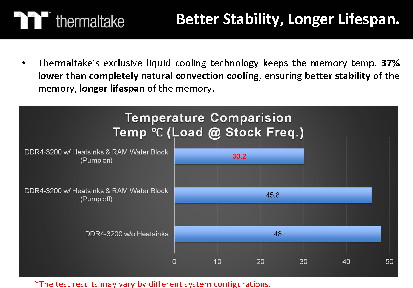 Производитель заявляет, что система охлаждения имеет гибридный принцип действия — радиаторы охлаждаются как водой (через водоблок), так и воздухом за счет конвекции. Также утверждается, что данная эксклюзивная система охлаждения позволяет снизить температуру модулей памяти на 37% в сравнении с модулями без радиаторов, что приводит к лучшей стабильности в работе памяти и увеличению срока службы этой самой памяти. В доказательство приводится диаграмма, где модули без радиаторов нагреваются до 48 °C, а с водяным охлаждением — до 30,2 °C: