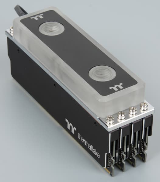В набор входит четыре модуля памяти с установленными радиаторами и водоблок. В собранном виде это выглядит так: