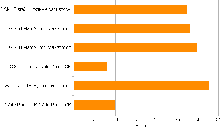 - Модули со штатными радиаторами G.Skill FlareX охлаждаются чуть-чуть, но все же лучше, чем вообще без радиаторов. Впрочем, разница настолько мала, что ее можно не учитывать.