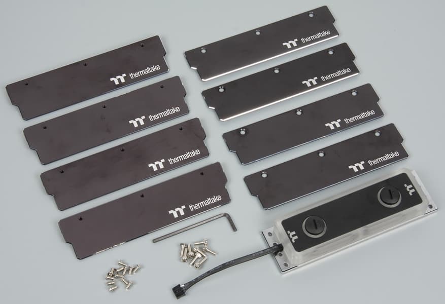 В итоге сборка всего этого не должна представлять особой сложности. Сначала планки памяти в сборе с радиаторами вставляются в разъемы на материнской плате (четыре друг за другом), потом с подошвы водоблока снимается защитная пленка, и он восемью винтами с головкой под шестигранный ключ закрепляется на радиаторах модулей памяти. Каждый радиатор к водоблоку притягивается двумя винтами, что должно обеспечить хороший прижим по всей плоскости верхнего торца радиатора. Останется дело за малым — подключить подсветку и охлаждающую жидкость.