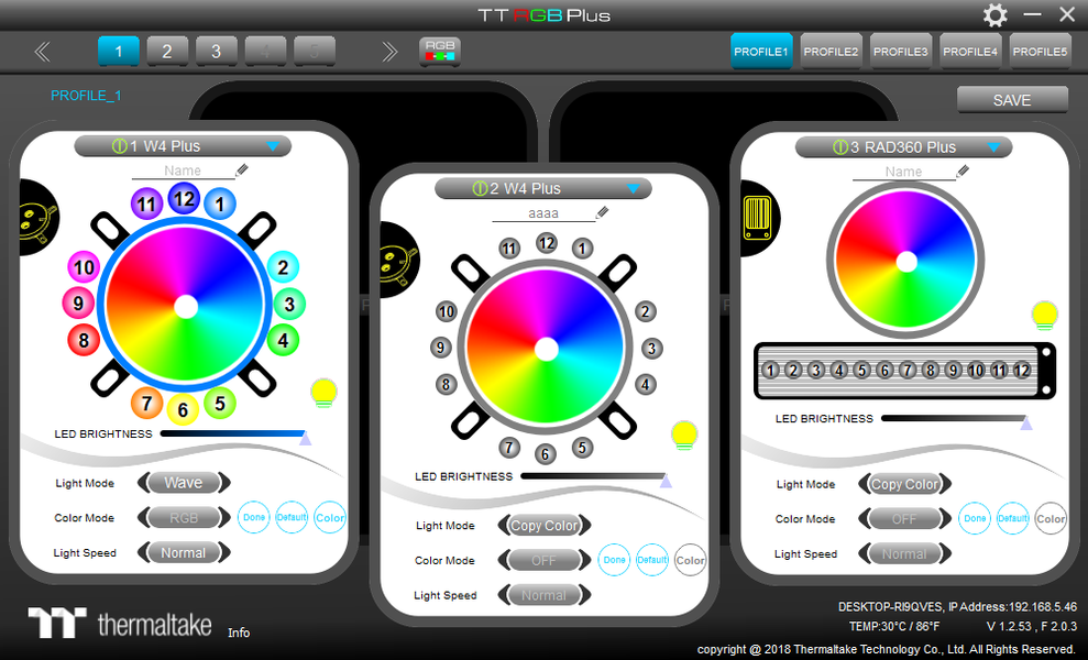 Управление вентиляторами и подсветкой устройств осуществляется с помощью ПО TT RGB Plus, работающего под ОС Windows версии 7 и выше. Эту программу нужно загрузить с сайта производителя. В окне программы размещено три панели управления на переднем плане и две на заднем, последние при смене фокуса перемещаются на передний план. Контроллер, к которому относятся эти панели, выбирается вверху слева.