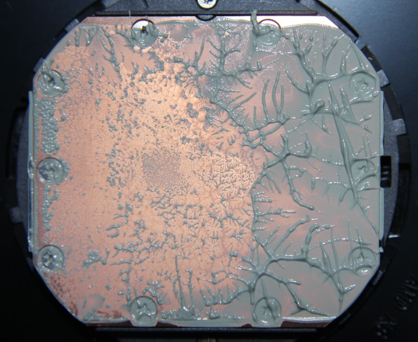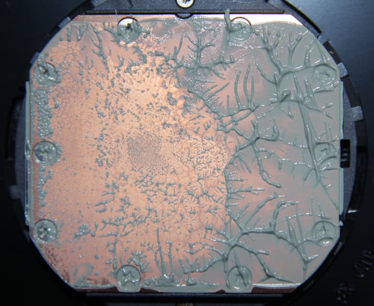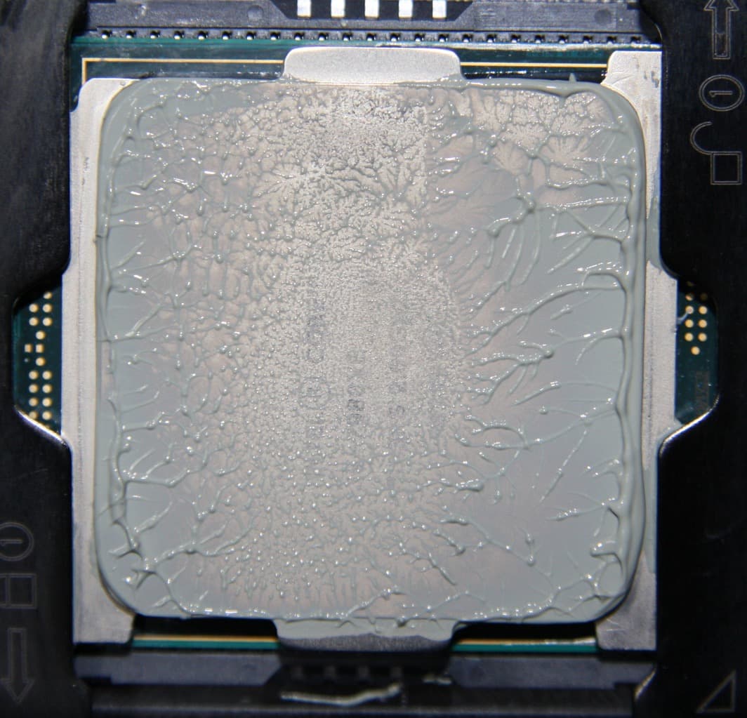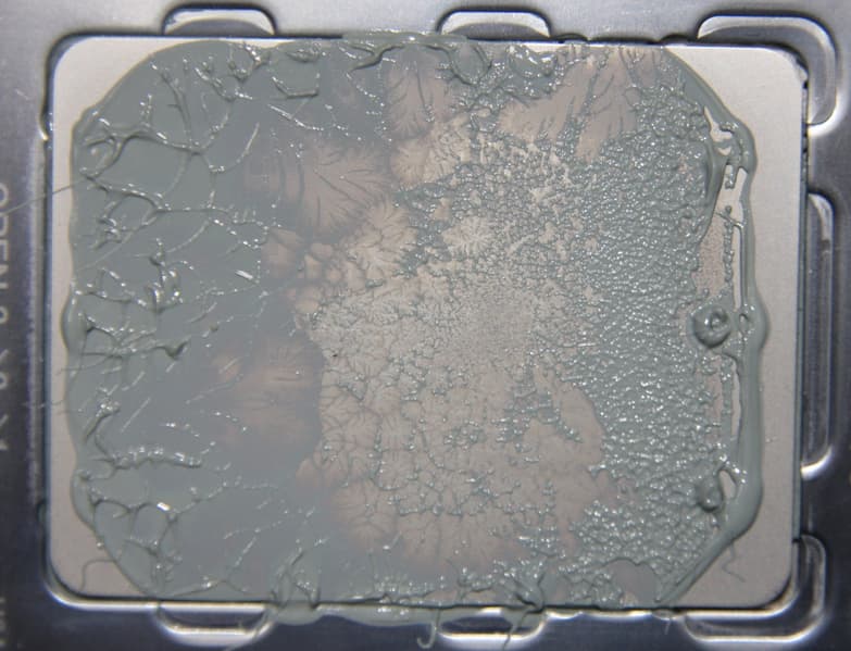 Видно, что термопаста распределилась практически по всей площади крышки процессора, а примерно по центру есть большой участок плотного контакта.