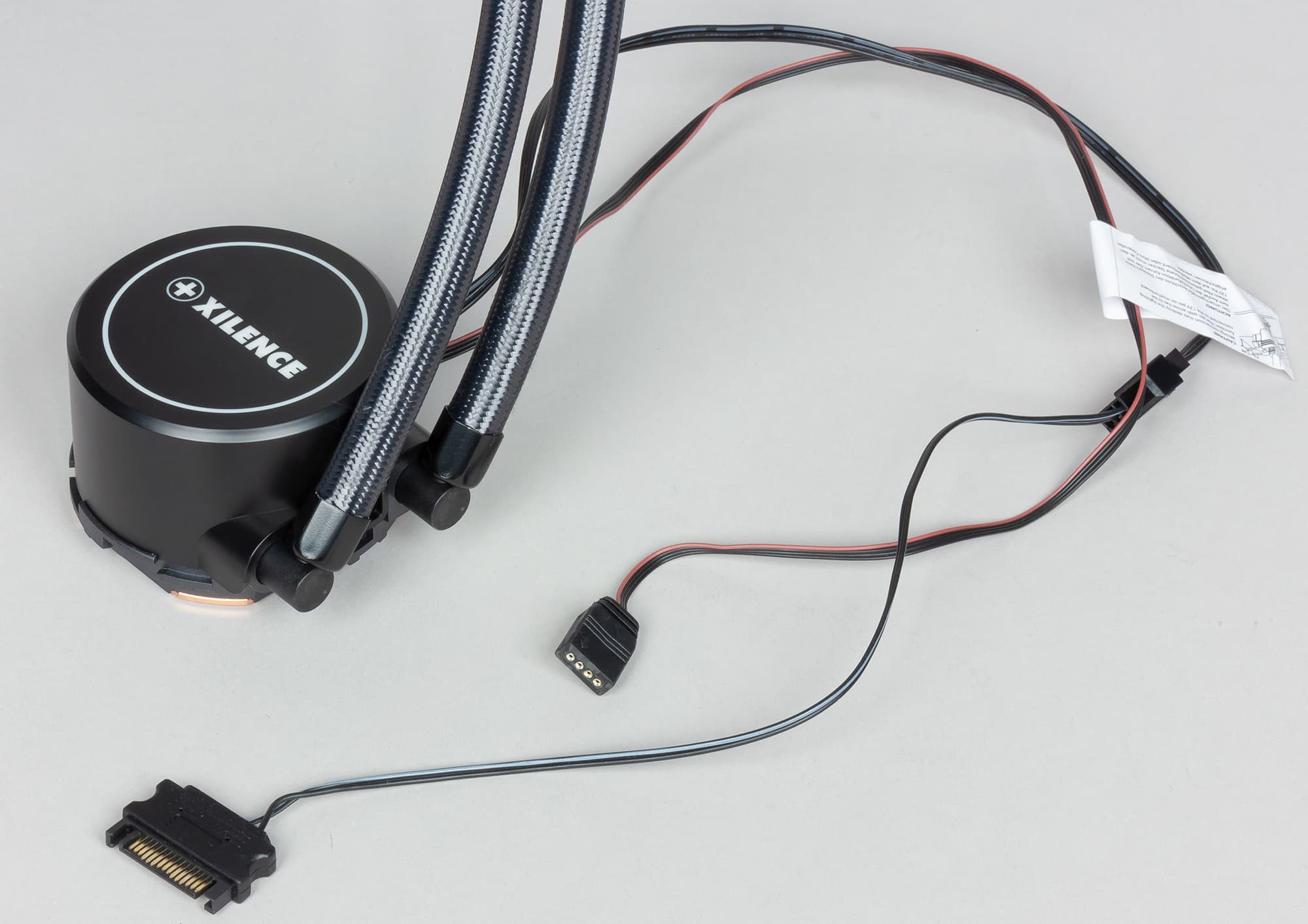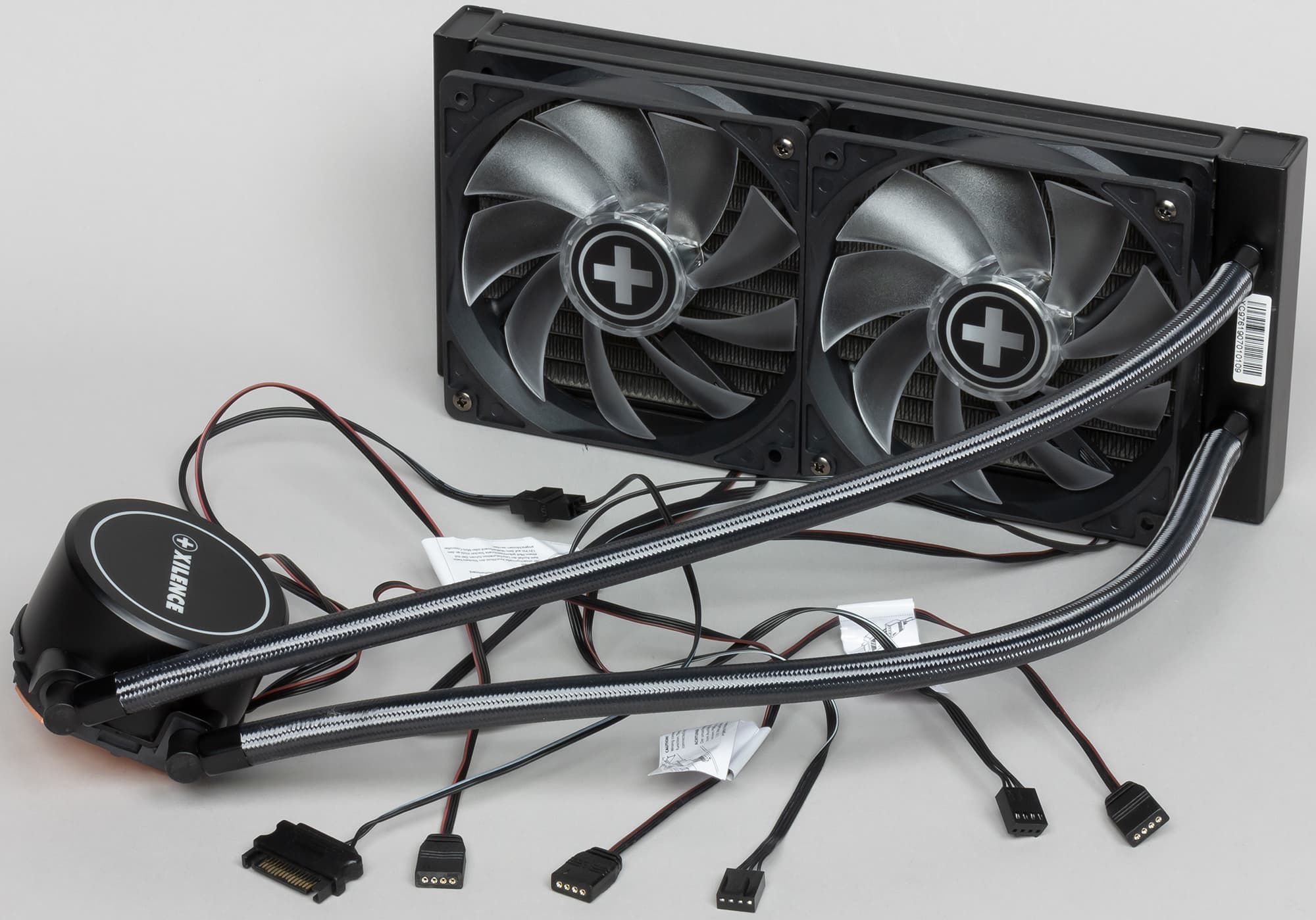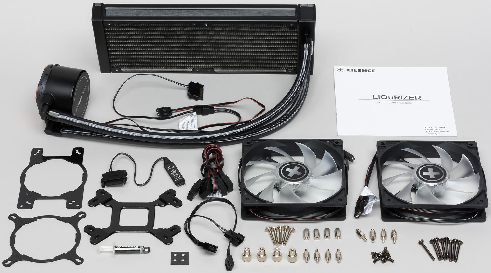 Внутри второй коробки находятся радиатор с подключенной помпой, вентиляторы, комплект крепежа, кабели, контроллер подсветки, термопаста в шприце и инструкция по установке.