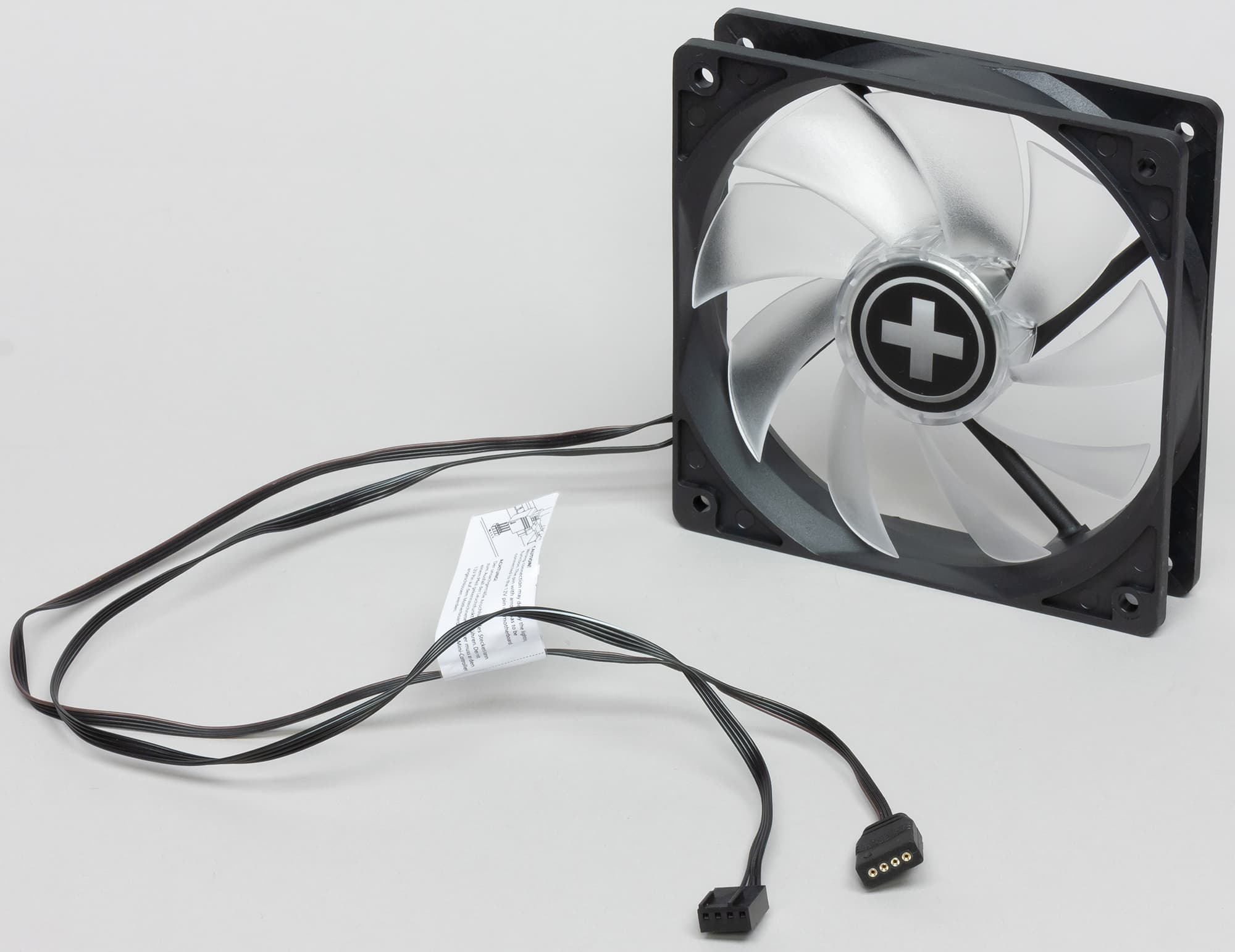 Крыльчатка вентилятора изготовлена из прозрачного пластика и снаружи слегка заматирована. На статоре вентилятора размещены четыре RGB-светодиода, которые подсвечивают крыльчатку изнутри. На подсветку идет отдельный кабель с четырехконтактным разъемом.