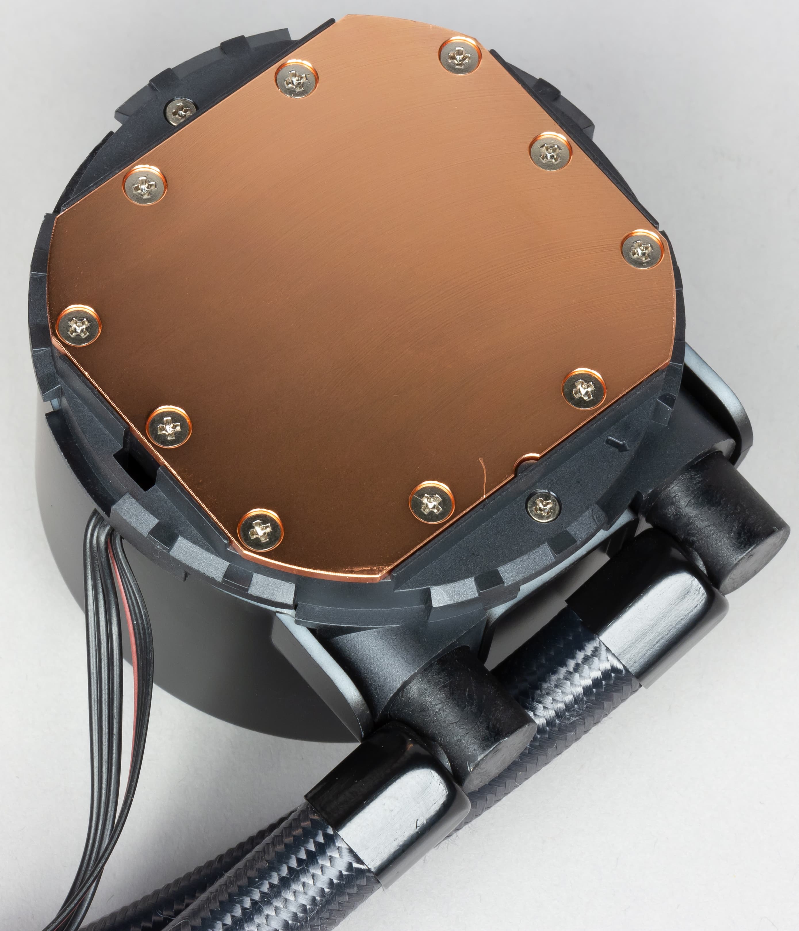 Система герметичная, заправлена, готова к использованию. Помпа интегрирована в один блок с теплосъемником. Подошвой теплосъемника, непосредственно прилегающей к крышке процессора, служит медная пластина (толщиной по видимой части 1,8 мм). Ее внешняя поверхность шлифованная и слегка полированная. Плоскость подошвы чуть-чуть (на 0,1-0,2 мм) выпуклая к центру.