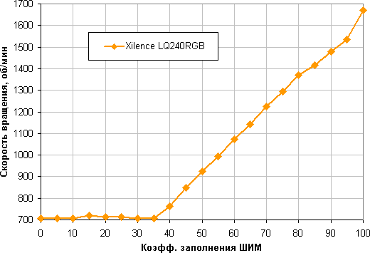 Диапазон регулировки не очень широкий: от 35% до 100% с более-менее плавным и близким к линейному ростом скорости вращения. При снижении коэффициента заполнения (КЗ) до 0 вентиляторы не останавливаются. Это может иметь значение, если пользователь хочет создать гибридную систему охлаждения, которая при низкой нагрузке работает полностью или частично в пассивном режиме.