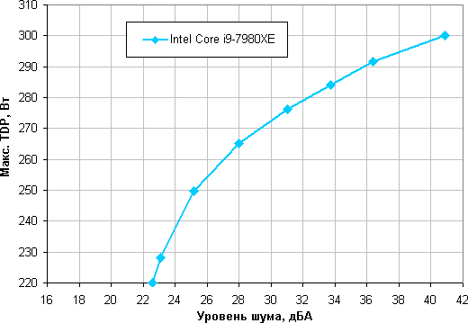 Приняв 25 дБА за критерий условной бесшумности, получим примерную максимальную мощность процессоров, соответствующих этому уровню. Это порядка 245 Вт для процессора Intel Core i9-7980XE. Гипотетически, если не обращать внимания на уровень шума, пределы мощности можно увеличить еще где-то до 300 Вт, соответственно. Еще раз уточним, это в жестких условиях обдува радиатора нагретым до 44 градусов воздухом, при снижении температуры воздуха указанные пределы мощности для бесшумной работы и максимальной мощности возрастают. В целом данная система является типичной по производительности в своем классе (на два вентилятора 120 мм).