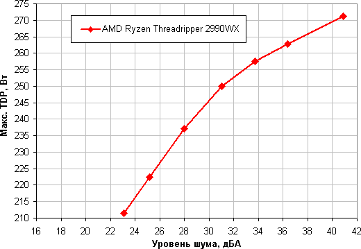 Потребляемая процессором мощность (в сумме по двум разъемам 12 В для питания процессора) меняется от 260 до 285 Вт по мере увеличения температуры процессора от 57 до 80 градусов. Ограничившись указанными выше условиями, построим зависимость реальной максимальной мощности (обозначенной как Макс. TDP), потребляемой процессором, от уровня шума уже в случае AMD Ryzen Threadripper 2990WX: