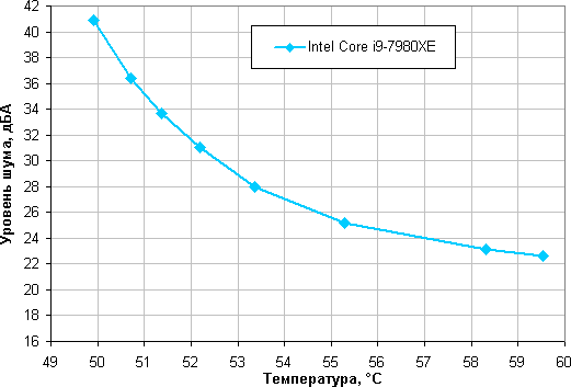 Зависимость уровня шума от температуры процессора при полной загрузке: