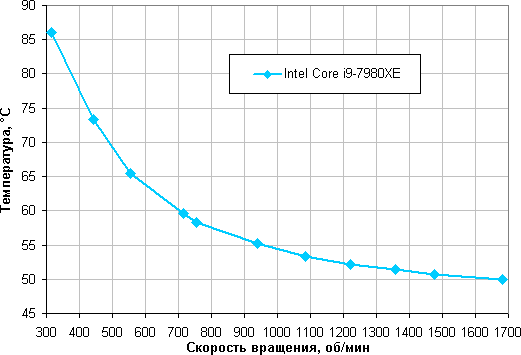 Формально в этом тесте наш процессор Intel Core i9-7980XE с TDP 165 Вт не перегревается даже на минимальных оборотах вентиляторов в случае регулировки с помощью только ШИМ. Можно даже понизить напряжение питания вентиляторов до 10, 8 и 6 В (первые три точки), но температура при КЗ = 30% и 6 В близка к критической.