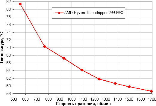 Зависимость температуры процессора AMD Ryzen Threadripper 2990WX при его полной загрузке от скорости вращения вентиляторов:
