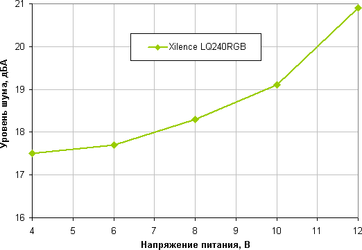 Уровень шума только от помпы равен примерно 21 дБА (иногда он немного меняется, видимо, из-за пузырьков жидкости). Помпа работает тихо. Приведем зависимость уровня шума только помпы от напряжения.