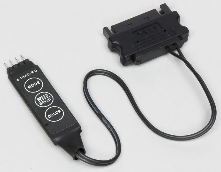 В комплекте есть RGB-кабель с четырьмя последовательными разъемами для подключения устройств с RGB-подсветкой (длина 35 см от входного разъема и по 10 см до разъемов для подключения устройств). Штыри на разъемах закрыты колпачками из пластика. Этот кабель можно использовать для подключения обоих вентиляторов и помпы к источнику, управляющему подсветкой. Если на материнской плате или на другом контроллере подсветки есть стандартный четырехконтактный разъем для подключения RGB-подсветки, то контроллер из комплекта можно не использовать. Комплектный контроллер управляет только работой подсветки. Кабель питания контроллера подключается к разъему питания SATA, что удобнее, чем к периферийному разъему («Molex»). Первая кнопка [Color] контроллера переключает цвет статической подсветки, вторая кнопка [Speed/Bright] — яркость статической подсветки или скорость изменения в динамических режимах, третья [Mode] — динамические режимы.