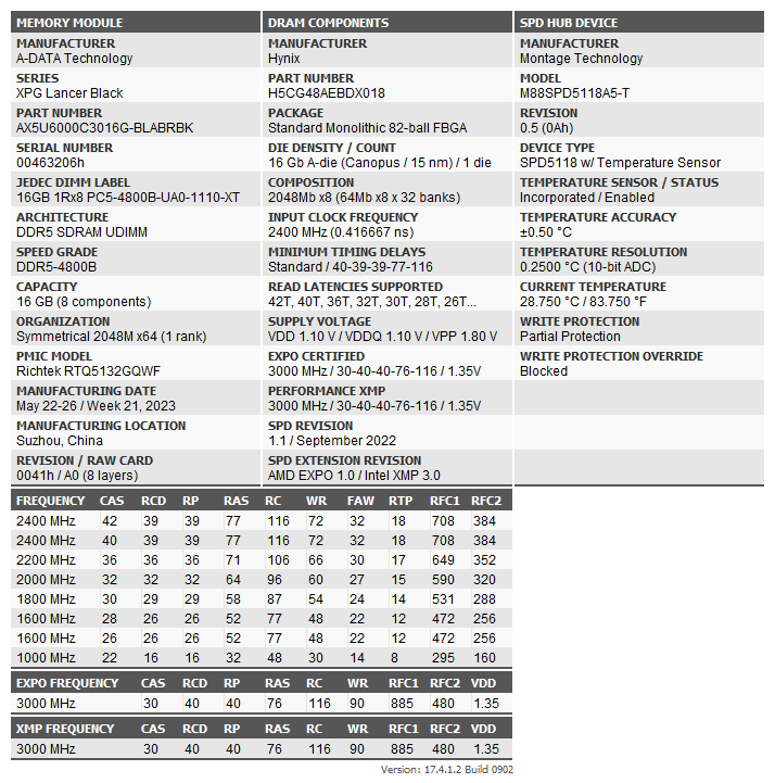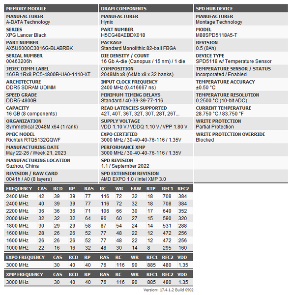 Как и следовало ожидать: по JEDEC это DDR5-4800 — многие производители не видят смысла сертифицировать оверклокерские модули под более высокие частоты, поскольку их всё равно никто не будет использовать. Один XMP-профиль — есть, аналогичный ему по основным параметрам Expo-профиль — тоже присутствует. Так что и на AMD, и на Intel это DDR5-6000 нажатием одной кнопки. Главное — опять SK Hynix, так что, возможно и не 6000.