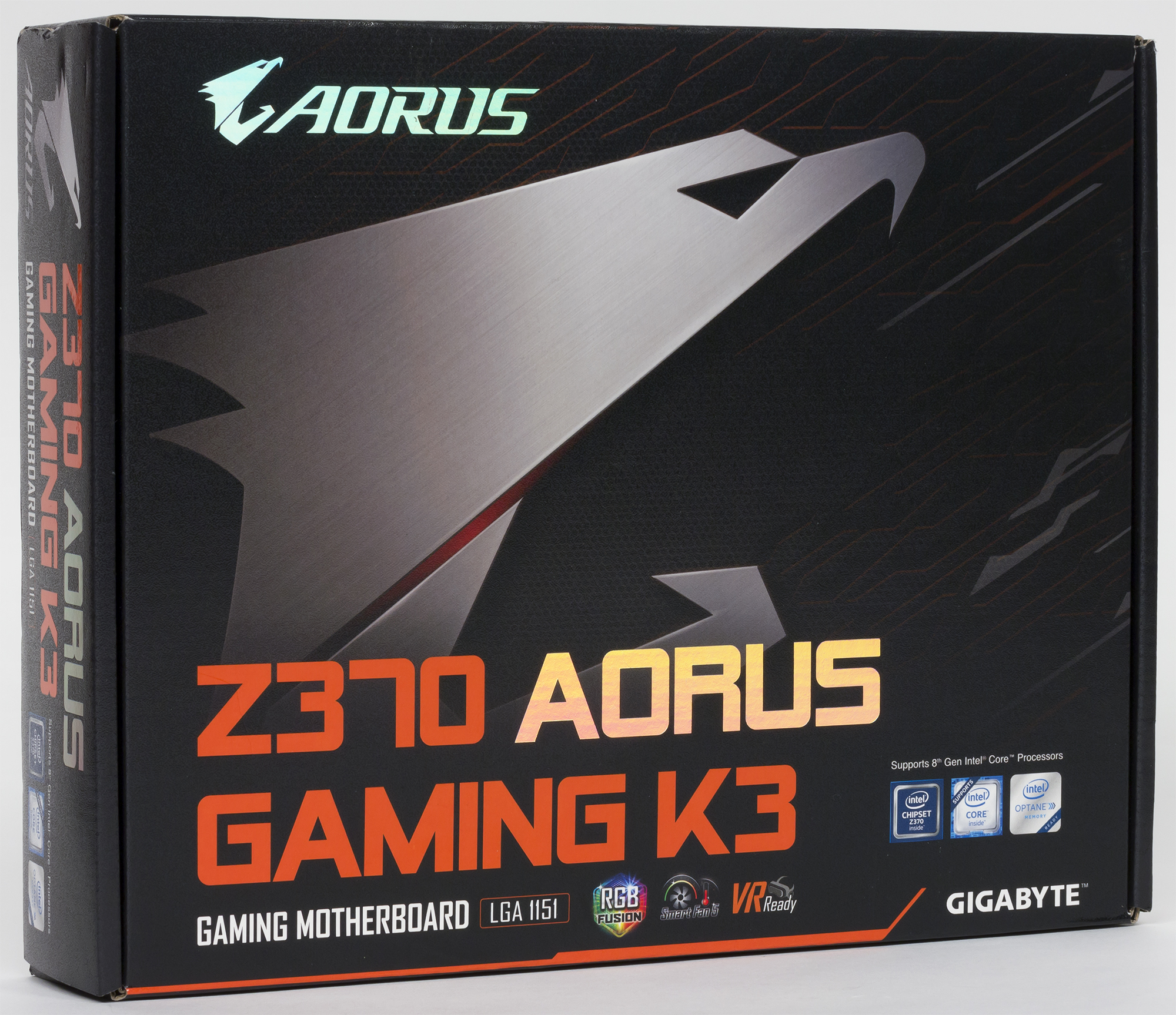 Плата Z370 Aorus Gaming K3 поставляется в небольшой по размерам коробке, оформленной в фирменном стиле линейки Aorus.