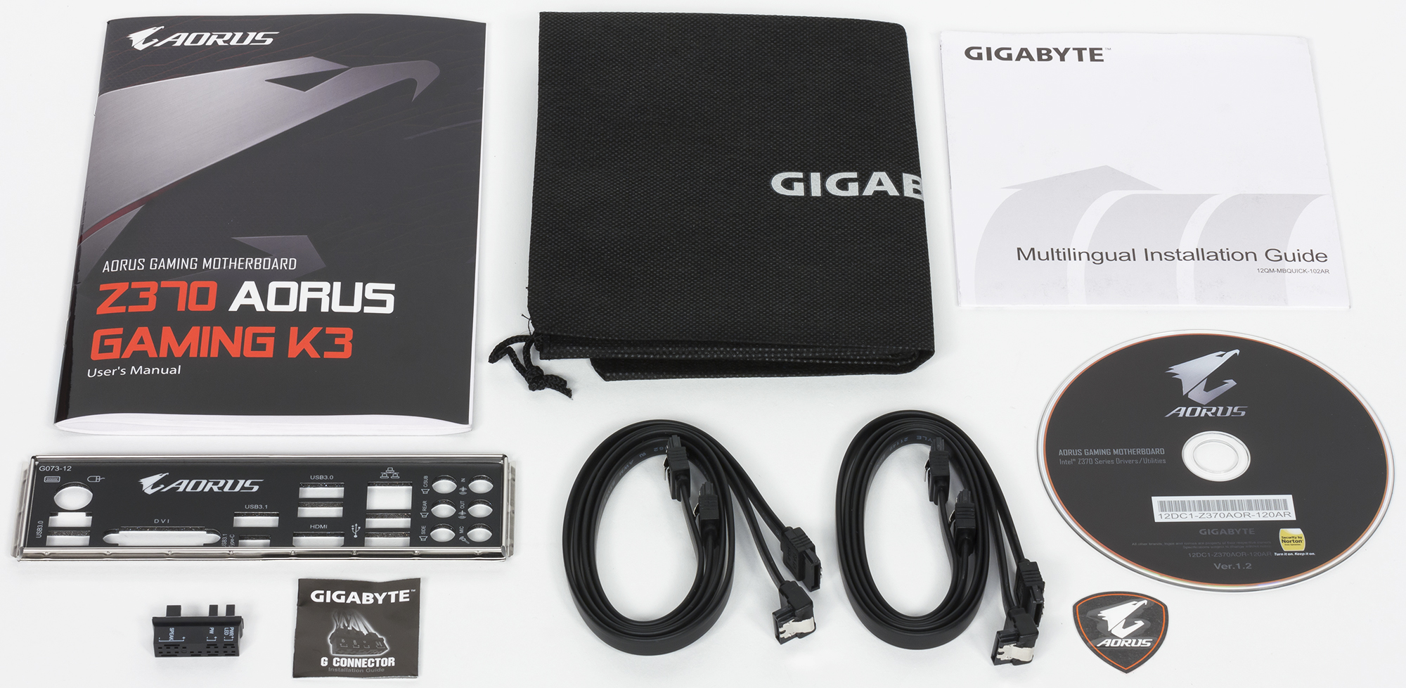 Комплект поставки очень скромный, если не сказать скудный: руководство пользователя (есть описание и на русском языке), DVD-диск с драйверами и утилитами, четыре SATA-кабеля (все разъемы с защелками, два кабеля имеет угловой разъем с одной стороны), заглушка для задней панели платы и G-коннектор для облегчения подключения проводов от фронтальной панели корпуса к плате. Еще есть непонятно для чего нужный матерчатый чехол и стикер с логотипом Aorus.