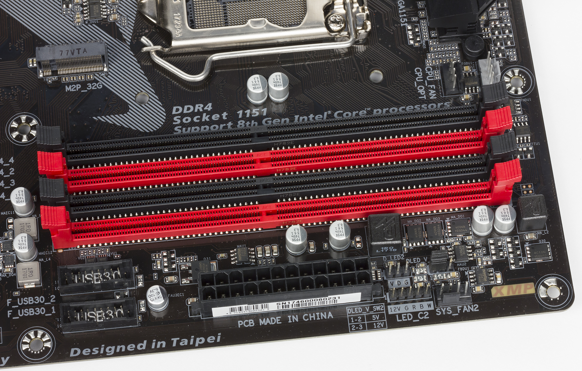 Для установки модулей памяти на плате Z370 Aorus Gaming K3 предусмотрено четыре DIMM-слота. Плата поддерживает небуферизованную память DDR4 (non-EСС), а максимальный объем памяти составляет 64 ГБ (при использовании модулей емкостью по 16 ГБ).