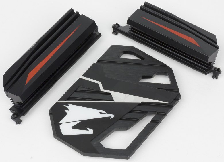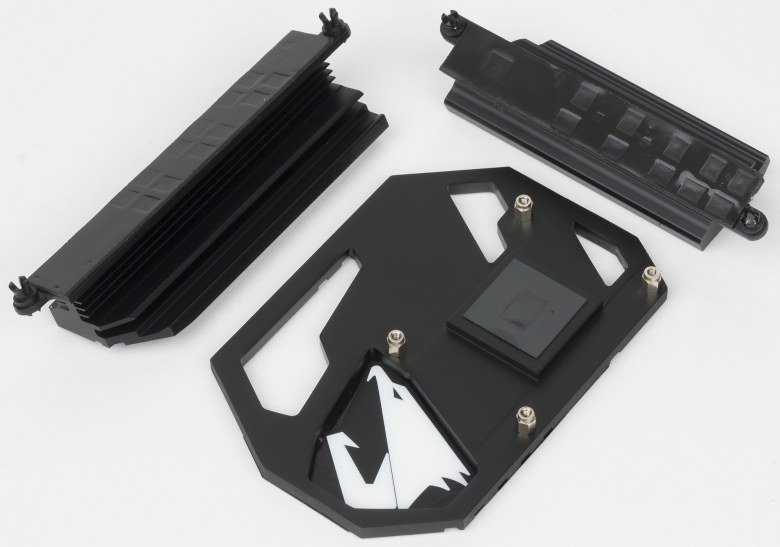 Система охлаждения платы Z370 Aorus Gaming K3 состоит из трех радиаторов. Два радиатора расположены по двум смежным сторонам процессорного разъема, они предназначены для отвода тепла от MOSFET-транзисторов регулятора напряжения питания процессора. Еще один радиатор предназначен для охлаждения чипсета.