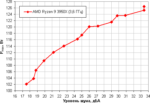 Приняв 25 дБА за критерий условной бесшумности, получим, что максимальная мощность процессора, соответствующая этому уровню, составляет порядка 117 Вт. Если не обращать внимания на уровень шума, то предел мощности можно увеличить где-то до 125 Вт. Еще раз уточним: это в жестких условиях обдува радиатора нагретым до 44 градусов воздухом. При снижении температуры воздуха указанные пределы мощности для бесшумной работы и максимальной мощности возрастают. Поэтому при условии достаточно хорошей вентиляции в корпусе данный кулер как-то справится с охлаждением процессора AMD Ryzen 9 3950X, но на возможность существенного разгона рассчитывать уже не стоит.