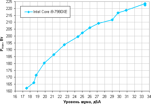 Приняв 25 дБА за критерий условной бесшумности, получим примерную максимальную мощность процессоров, соответствующих этому уровню. Это порядка 200 Вт для процессора Intel Core i9-7980XE. Если не обращать внимания на уровень шума, то пределы мощности можно увеличить где-то до 220 Вт. Еще раз уточним, это в жестких условиях обдува радиатора нагретым до 44 градусов воздухом, при снижении температуры воздуха указанные пределы мощности для бесшумной работы и максимальной мощности возрастают.