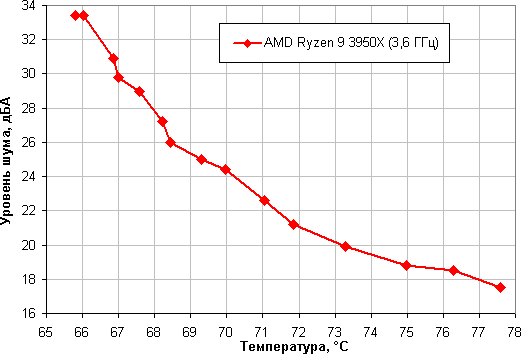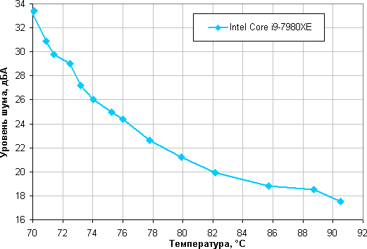 Зависимость уровня шума от температуры процессора при полной загрузке: