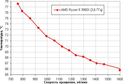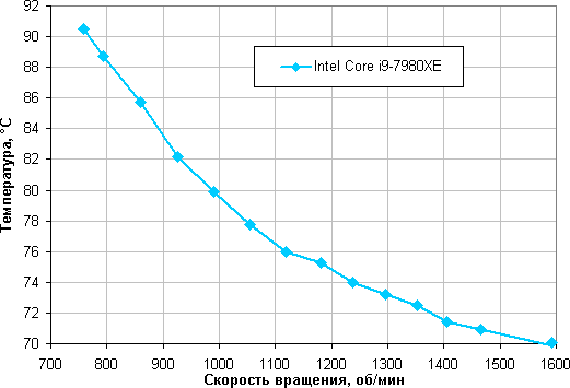 Зависимость температуры процессора при его полной загрузке от скорости вращения вентиляторов: