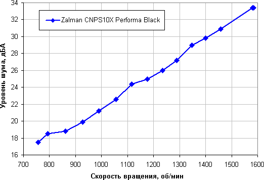 Зависит, конечно, от индивидуальных особенностей и других факторов, но в случае кулеров где-то от 40 дБА и выше шум с нашей точки зрения очень высокий для настольной системы, от 35 до 40 дБА уровень шума относится к разряду терпимых, ниже 35 дБА шум от системы охлаждения не будет сильно выделяться на фоне типичных небесшумных компонентов ПК — вентиляторов корпусных, на блоке питания, на видеокарте, а также жестких дисков, а где-то ниже 25 дБА кулер можно назвать условно бесшумным. Фоновый уровень был равен 16,0 дБА (условное значение, которое показывает шумомер). Кулер Zalman CNPS10X Performa Black можно считать относительно тихим устройством.