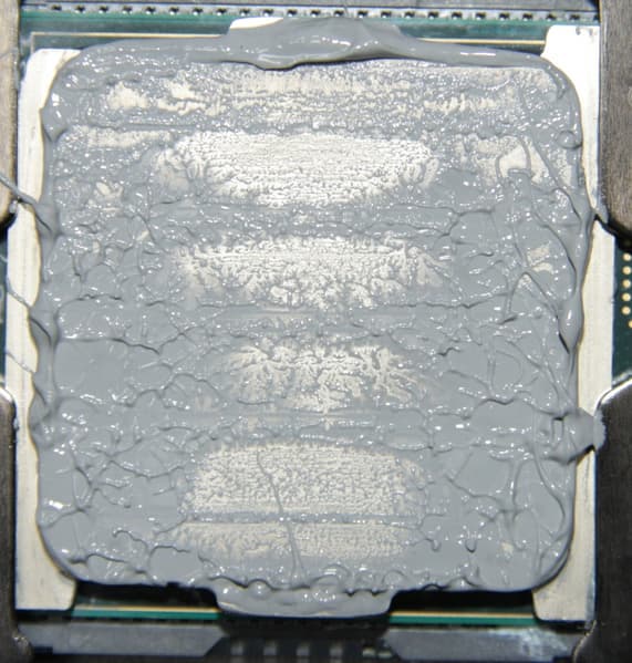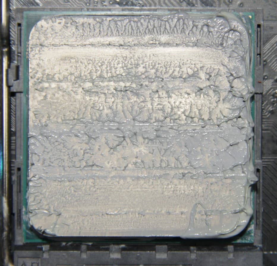 В данном случае слой термопасты также имеет очень небольшую толщину на большей части крышки процессора, а пятна плотного контакта больше.