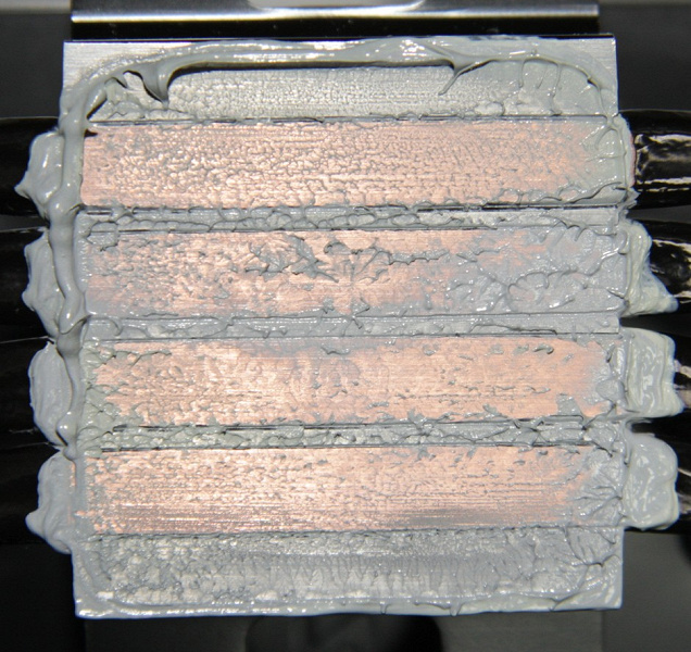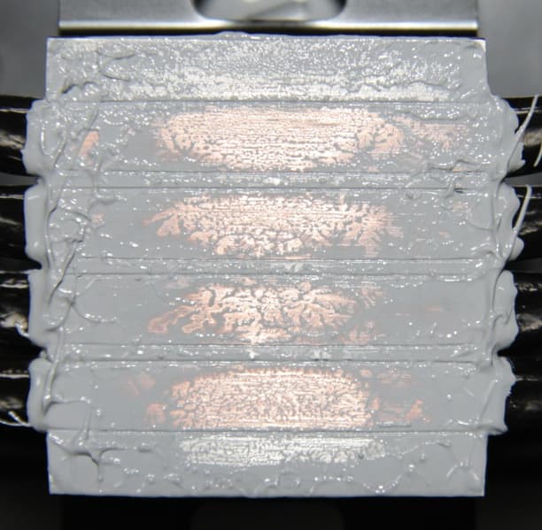 Видно, что термопаста распределилась тонким слоем почти по всей плоскости крышки процессора, а ее избыток выдавился по краям. В центральных областях тепловых трубок есть выраженные пятна плотного контакта. Впрочем, это объясняется тем, что крышка данного процессора не идеально плоская, а заметно выпуклая.