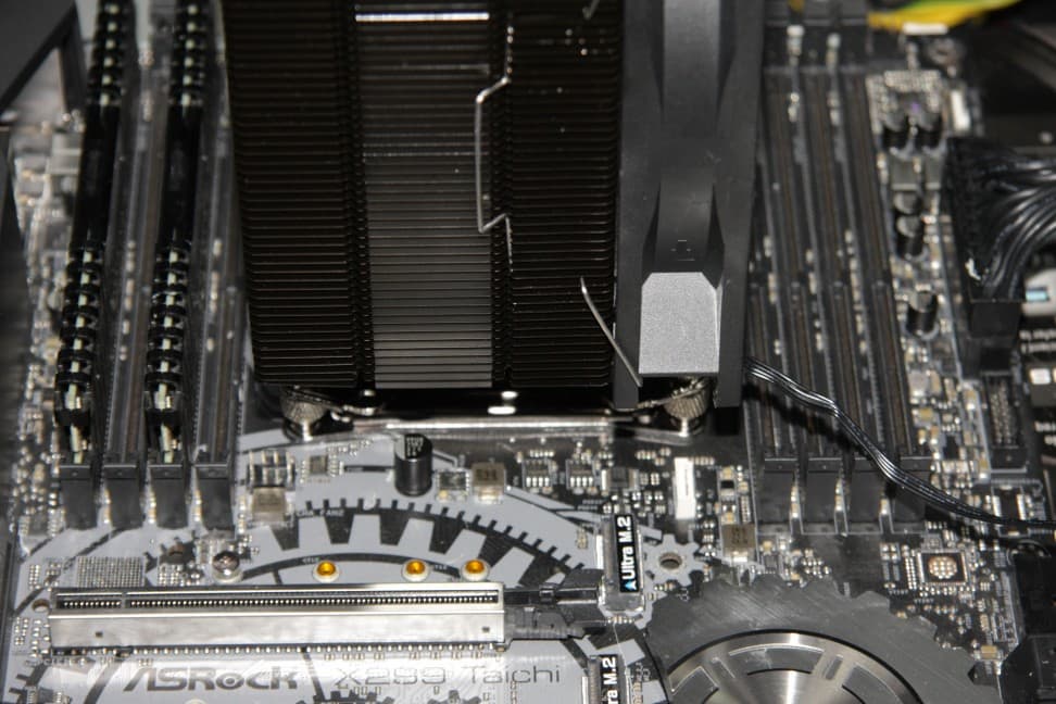Кулер относительно компактный. Все разъемы для оперативной памяти остаются доступными для установки высоких модулей памяти. Наглядный пример: