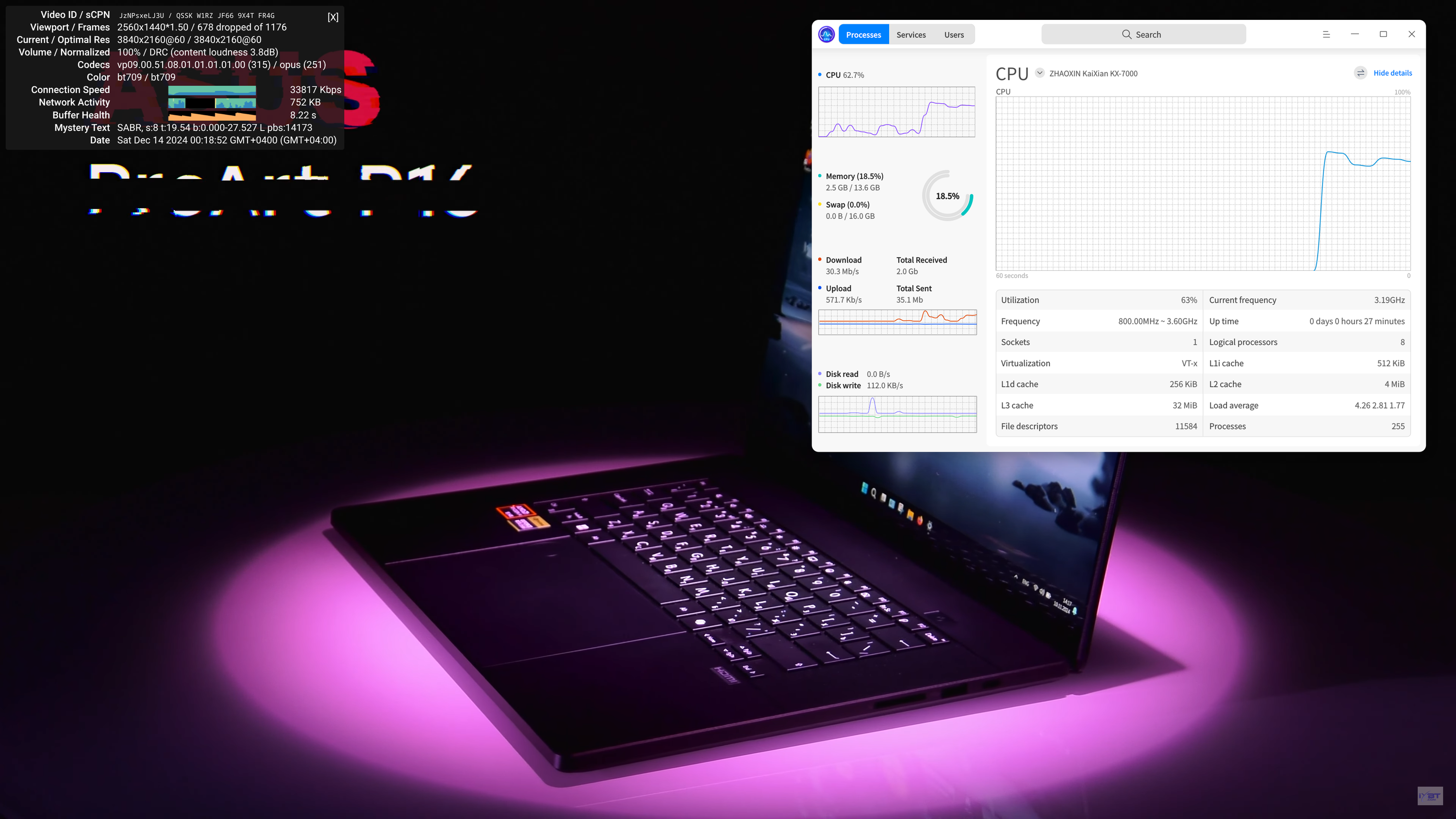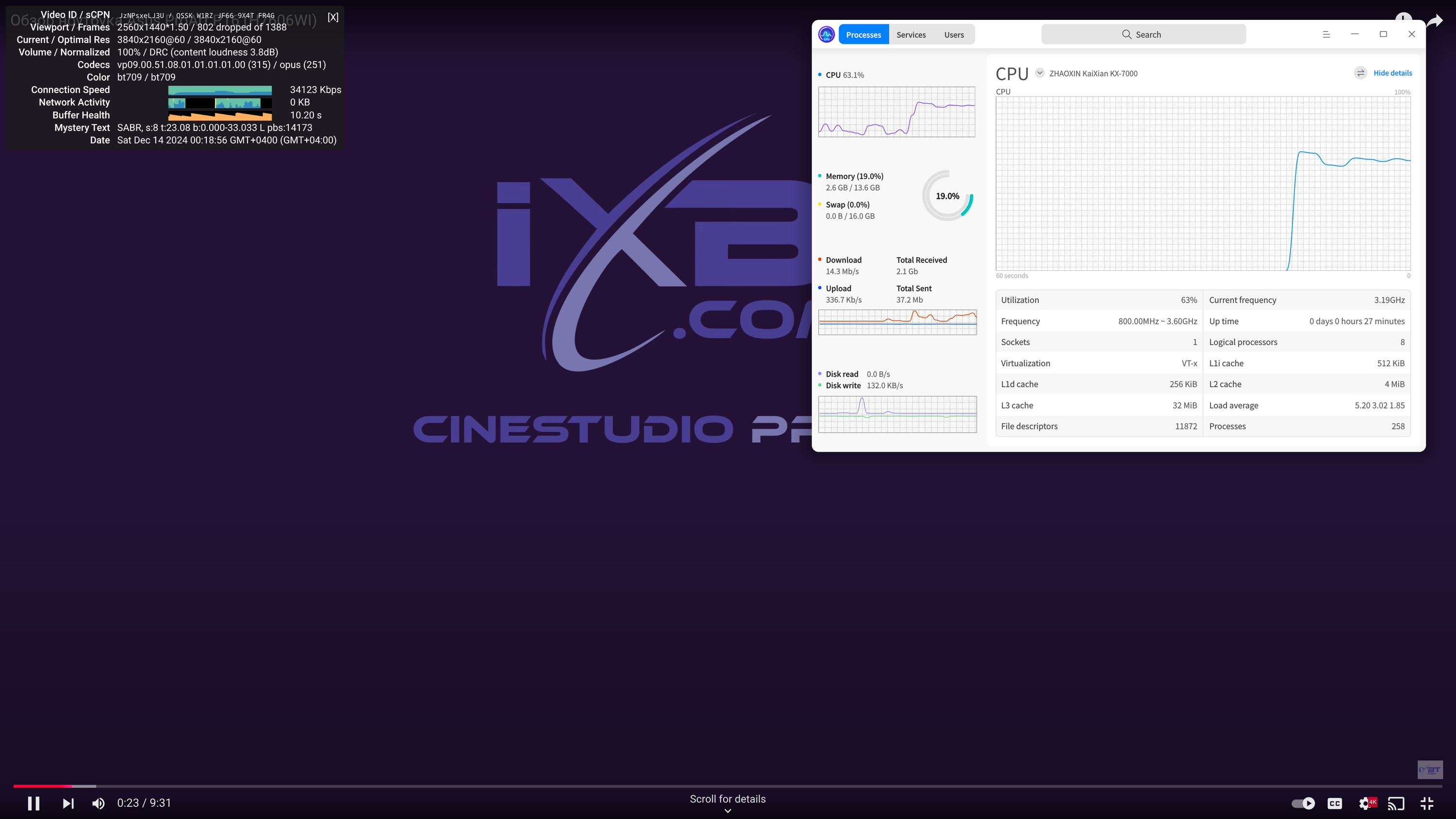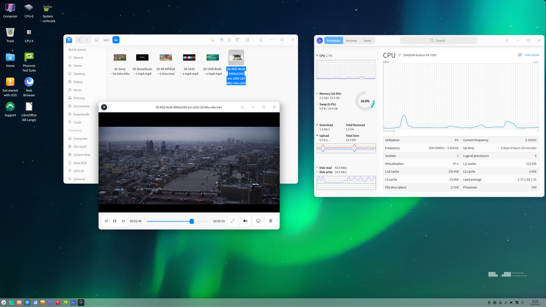 С одной из распространенных задач современного ПК — просмотром видеороликов различных форматов в высоких разрешениях, у Zhaoxin всё оказалось неплохо, специализированные блоки для аппаратного ускорения декодирования видеоданных, разгружающие остальные компоненты системы, в процессоре Zhaoxin имеются, и встроенный GPU официально поддерживает аппаратное ускорение декодирования видеоданных в наиболее востребованных форматах, поэтому никаких сложностей у системы на базе KaiXian KX-7000 с этой задачей возникнуть не... должно было — при соответствующей программной поддержке.