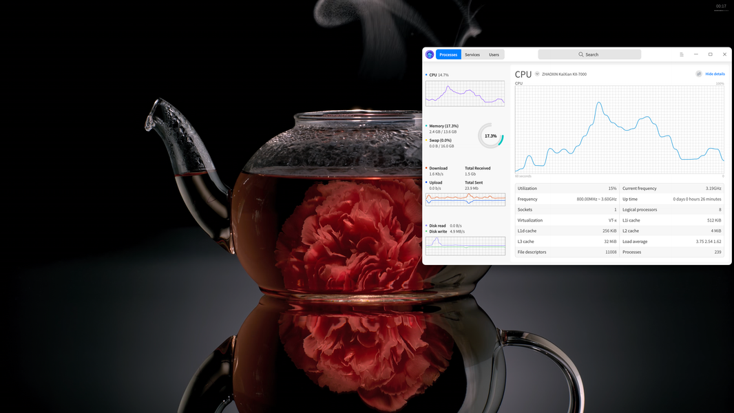 Хотя в диспетчере задач UOS для KaiXian KX-7000 указана единая максимальная частота — 3,6 ГГц, на деле лишь два ядра из восьми могут работать на частоте до 3,6 ГГц, а максимум для остальных пониже — на уровне 3,4 ГГц. В целом, все данные о процессоре более-менее соответствуют тому, что рассказывает публике о возможностях своего процессора китайская компания Zhaoxin, так что давайте перейдем к реальным тестам.