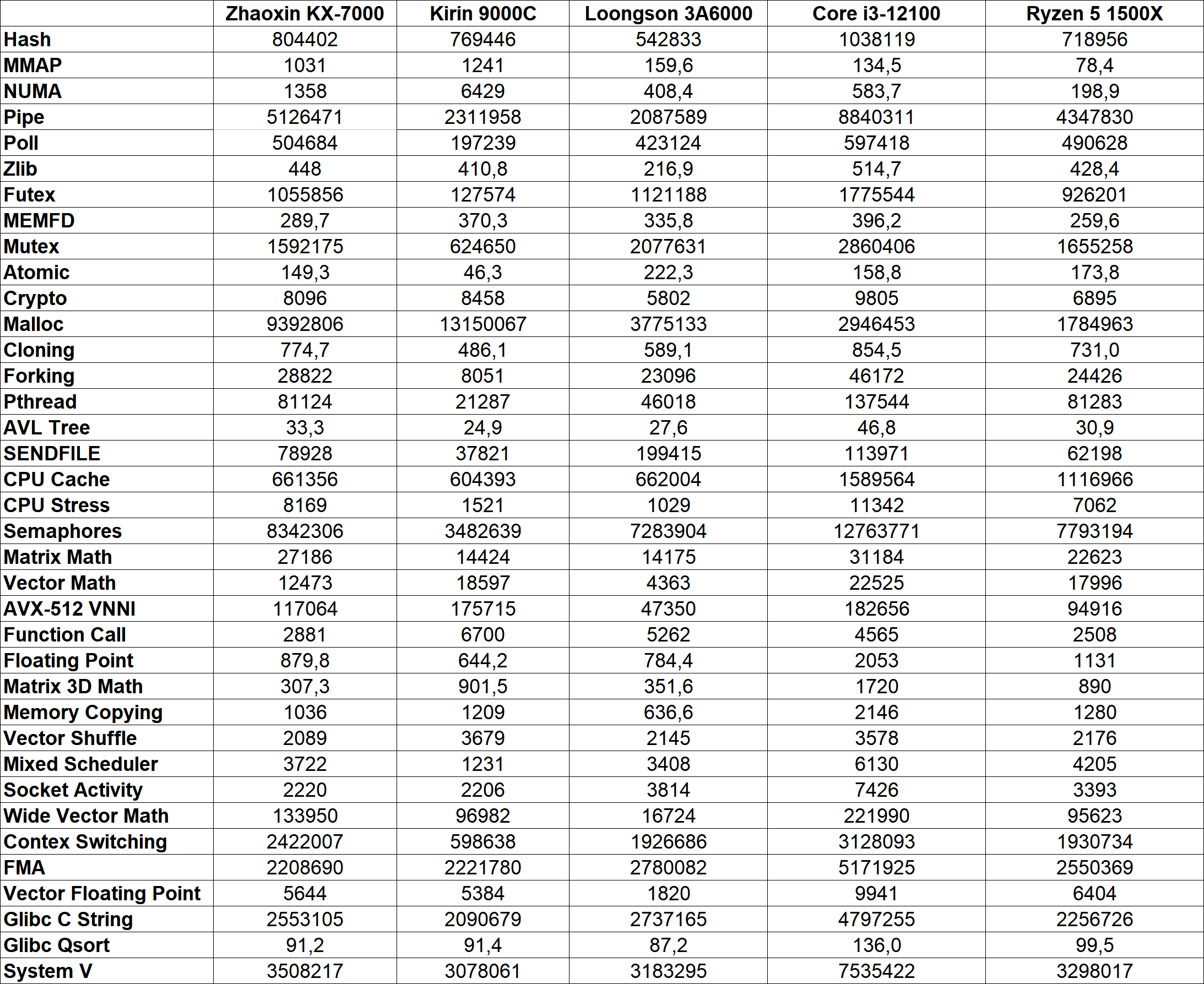 А вот тут KaiXian KX-7000 оказался весьма быстрым — ладно процессор Kirin 9000C, который показал очень низкий результат в этом тесте более чем в 6 раз хуже — из-за нехватки памяти, которой у этой системы было вдвое меньше, но даже Loongson 3A6000 уступил рассматриваемому сегодня процессору почти в полтора раза. x86-совместимый китайский процессор Zhaoxin показал результат на треть лучше Ryzen 5 1500X в этом тесте, так что по IPC тут всё очень неплохо. Хотя Core i3-12100 всё равно еще почти на 30% быстрее, так что китайцам всё еще есть над чем работать, учитывая преклонный возраст этих западных CPU.