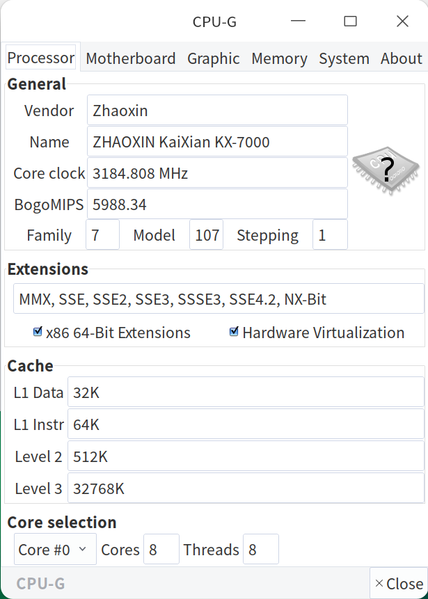 Все основные данные на экране есть, CPU-X дает их чуть больше, хотя некоторые страницы утилит выдали некорректные сведения, а бывает и так, что подобное системное ПО вовсе аварийно завершало работу при попытке их получить и отобразить, поэтому данные о CPU всё же неполные — сравнительно малая распространенность китайского процессора Zhaoxin дает о себе знать. Дополнительно интересна информация о том, на какие частоты способны соответствующие ядра — эту информацию обеспечила утилита HardInfo, в частности: