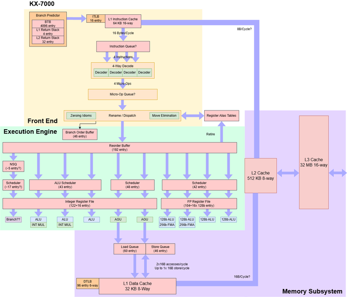 Внешний интерфейс KX-7000 выбирает инструкции из кэша инструкций объемом 64 КБ, который может выдавать по 16 байт за такт, подавая данные в 4-байтовый декодер. Архитектура Century Avenue не использует кэш операций или буфер циклов, и пропускная способность кэша инструкций может ограничивать общую производительность, которая резко снижается при выходе кода за пределы кэша инструкций, также производительность снижается, когда код попадает в L3-кэш — до менее чем 4 байт за такт. А ведь даже древний Skylake может выполнять код из L2-кэша со скоростью более 12 байт за такт, исполняя более чем три 4-байтовые инструкции за такт.