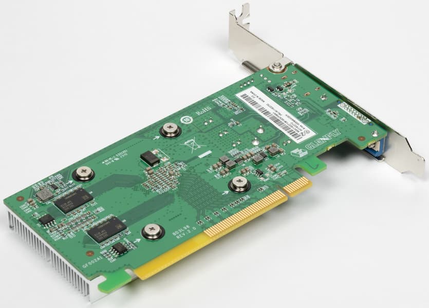 Интересно, что хотя процессор Zhaoxin имеет встроенное графическое ядро под наименованием ZX C-1190 с приличными возможностями, но в ПК на его основе от Lenovo установлена еще и внешняя видеокарта дочерней компании — Glenfly Arise1020. Мы рассмотрим возможности этих GPU подробнее уже во второй части статьи с тестированием в Windows, но уже по фотографиям понятно, что ничего особенного и от нее ждать не нужно — это очень простенькая и слабая видеокарта с 2 ГБ памяти, достаточная для вывода 2D-картинки, декодирования видео в распространенных форматах, а также очень простого 3D-рендеринга. Всё это может и встроенный GPU, и зачем сюда ставить еще и отдельную видеокарту — вопрос.