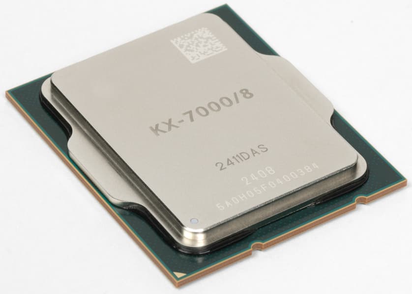 К слову о кристаллах — в KX-7000, по сравнению с его предшественниками, изменилась и компоновка — она стала многокристальной, рассматриваемый процессор состоит из кристалла (или чиплета) с вычислительными ядрами CPU и кэш-памятью площадью 78,6 мм², а также кристалла ввода-вывода с встроенным графическим ядром площадью 151,8 мм². Кристалл ввода-вывода содержит контроллер памяти с поддержкой стандартов памяти DDR4-3200 и DDR5-4800 емкостью до 128 ГБ, также в нем есть встроенный графический процессор ZX C-1190 и контроллер SATA III с поддержкой до четырех портов.