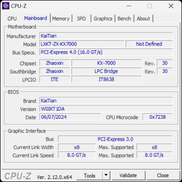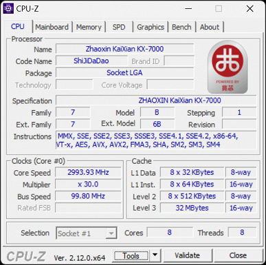 Из интересного конкретно в Windows-тестировании приведем данные информационной утилиты CPU-Z об установленном процессоре Zhaoxin KaiXian KX-7000 — они несколько шире, чем у аналогичных утилит в Linux, но в целом подтверждают всю известную нам информацию о китайском процессоре: о количестве ядер, объеме кэш-памяти всех уровней и т. д. Также доступна информация и о системной плате, включая чипсет (встроенный в CPU), версию BIOS и возможности поддержки плат расширения PCI Express.