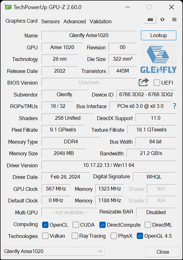 Похожие на это описание видеокарты семейства Arise 1 позднее выпустило графическое подразделение компании — GlenFly Technology. Архитектура эта основана на последних разработках VIA Technologies, известных под маркой S3 Graphics, как и интегрированная графика ZX C-1190, но с программной точки зрения они отличаются. Видеокарта под названием Arise 1020 использует низкопрофильный форм-фактор для компактных систем и не имеет разъемов дополнительного питания, ограничиваясь максимальными 75 Вт по разъему PCIe x16. Она выглядит как типичная дешевая видеокарта многолетней давности, использует очень простую систему охлаждения с маленькими радиатором и вентилятором, и имеет на борту разъемы HDMI и VGA. Судя по поддержке вывода данных в 4K-разрешении с частотой 60 Гц, поддерживается версия HDMI 2.0, хотя возможен и вариант 1.4 со снижением цветовой субдискретизации до YCbCr420.