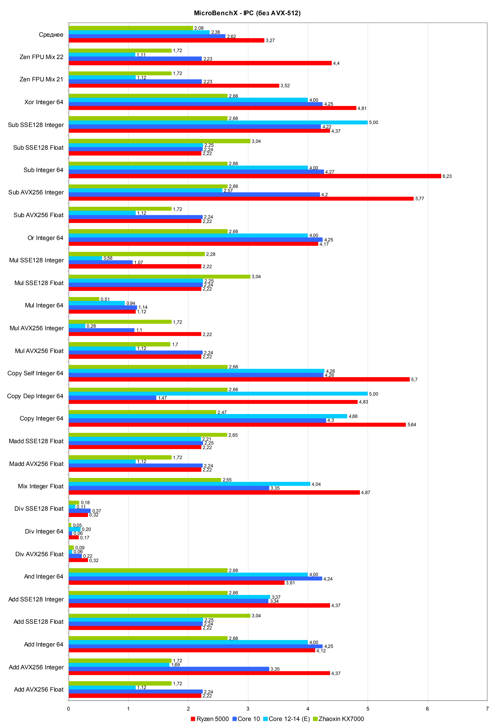Пожалуй, это один из самых любопытных тестов при исследовании совершенно новой x86-совместимой микроархитектуры, отличающейся от решений AMD и Intel. Это самое низкоуровневое сравнение, которое покажет все именно микроархитектурные слабости Zhaoxin KaiXian KX-7000. А они у него наверняка есть, как показали наши тесты в Linux. Естественно, сравнивать лучшее из творений Zhaoxin с мощнейшими ядрами AMD и Intel последнего времени просто нет смысла, но и результатов совсем уж старых западных CPU у нас нет, поэтому мы сравнили KX-7000 с Ryzen 5000 (Zen 3 из 2020 года) и Core 10-го поколения (Comet Lake из 2019 года) а также c E-ядрами Core поколений с 12 по 14 (Gracemont, начиная с Alder Lake 2021 года) — с куда более мощными P-ядрами не сравниваем, не перепутайте.
