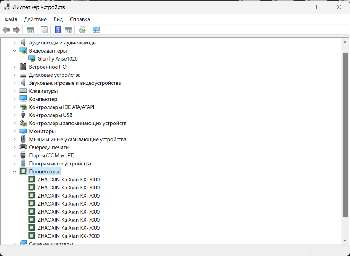 Так как процессоры Zhaoxin полностью поддерживают набор команд x86, то они совместимы с соответствующими операционными системами, включая Microsoft Windows и многочисленные вариации Linux. Вариант на основе Linux в виде Unity OS (UOS), операционной системы китайской разработки компании Tongxin Software, основанной на дистрибутиве Deepin, мы уже рассмотрели в первой части нашего материала, а теперь время перейти к тестам под более привычной для многих пользователей системе Microsoft Windows, в частности — последней на момент тестов версии Windows 11. Необходимые драйверы можно найти на сайте Zhaoxin, где они появились в конце 2024 или в начале 2025 года — все они полностью совместимы с Windows 10 и Windows 11. В диспетчере устройств при их установке всё выглядит как обычно:
