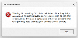 - Ashes of the Singularity — DX12-версия игры выводит предупреждение на старте и затем виснет, DX11-версия также пишет предупреждение, затем запускается и зависает или вылетает при запуске игрового процесса из меню.